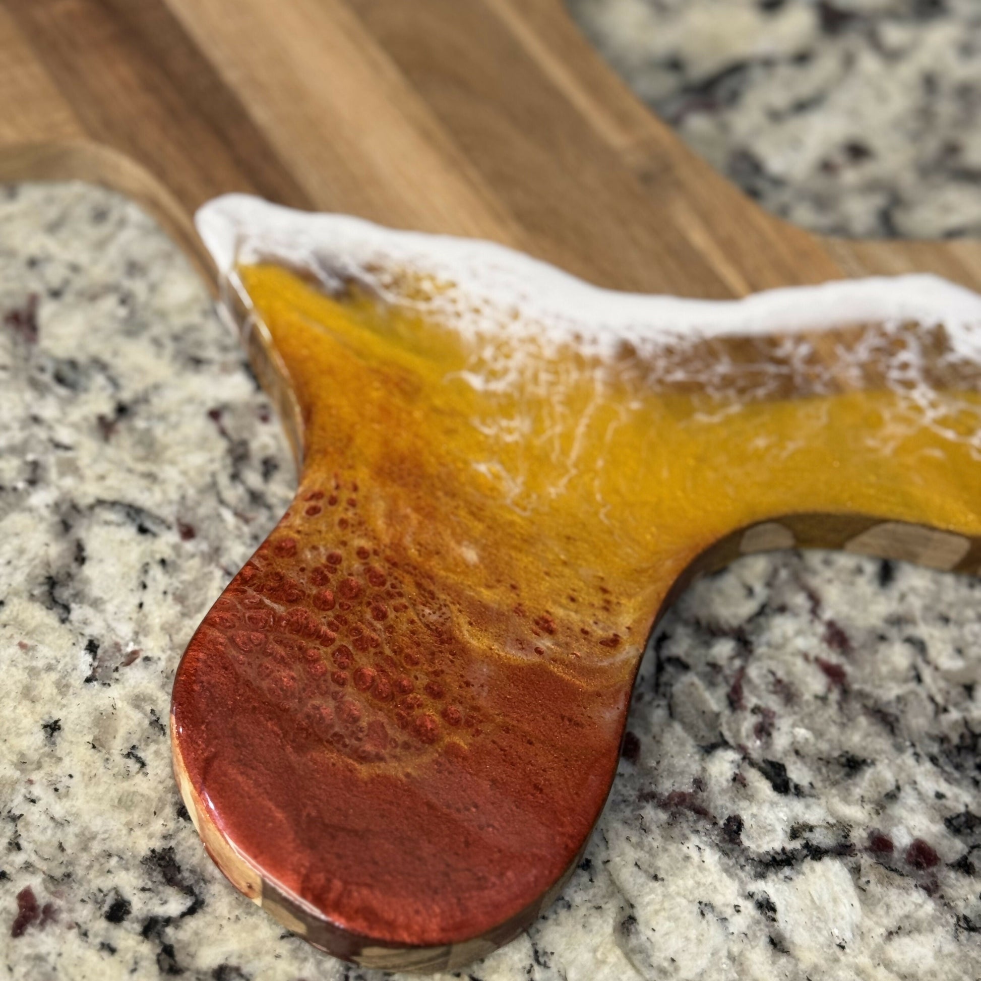Bring a festive feeling to your kitchen with this Acacia Wood Gingerbread Man Cutting Board! This cutting board is shaped like a classic Gingerbread Man and features a natural wood grain design with an epoxy detail. Create a yummy charcuterie board filled with meats, cheeses, nuts, and fruit for your friends and family to enjoy!
