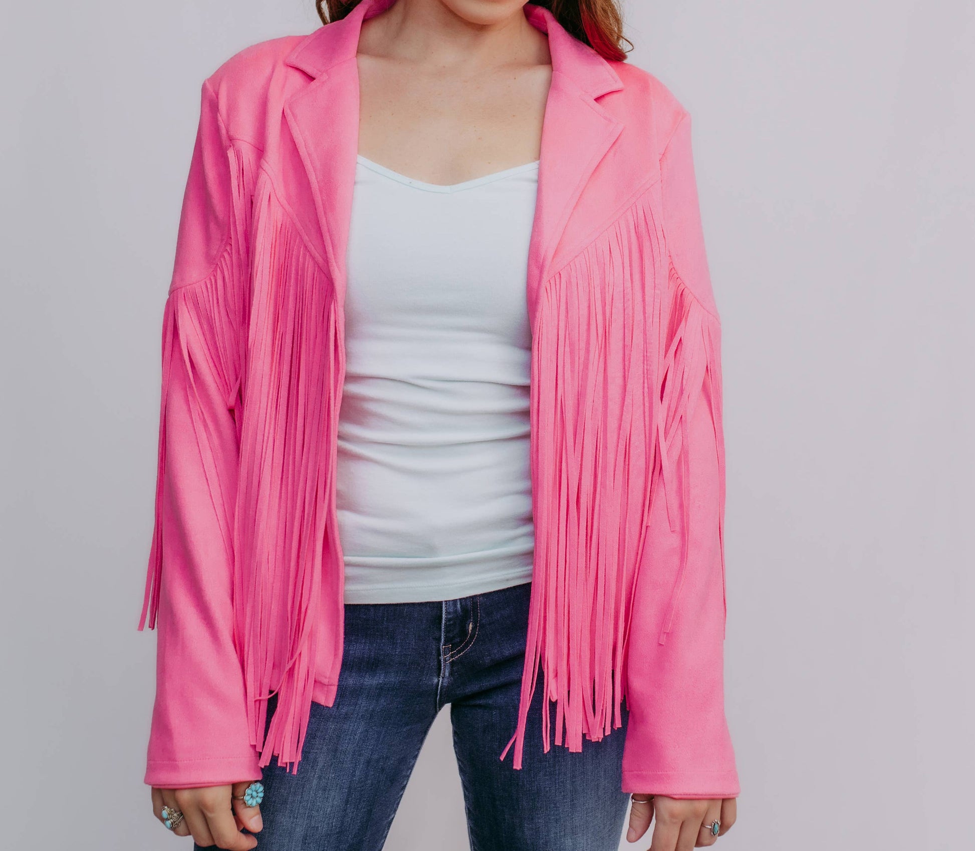 Turn heads with our Barbie Fringe Jacket— a bold fusion of western charm and modern flair. Crafted from soft, premium faux suede, it features playful, flowing fringe details along the sleeves front and across the back for a touch of movement and personality. The tailored open-front design makes it easy to layer over your favorite tops, while the striking hot-pink hue adds an instant pop of color to any outfit.