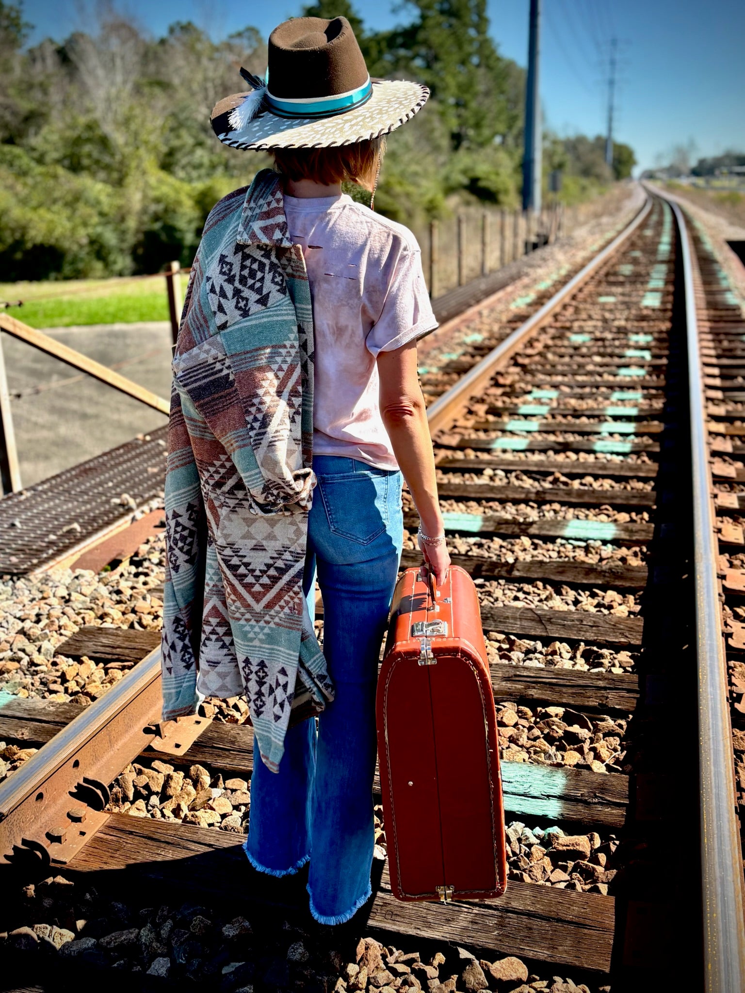 Aztec & Plaid Printed Shacket Jacket. Just warmth enough but isn’t super thick.